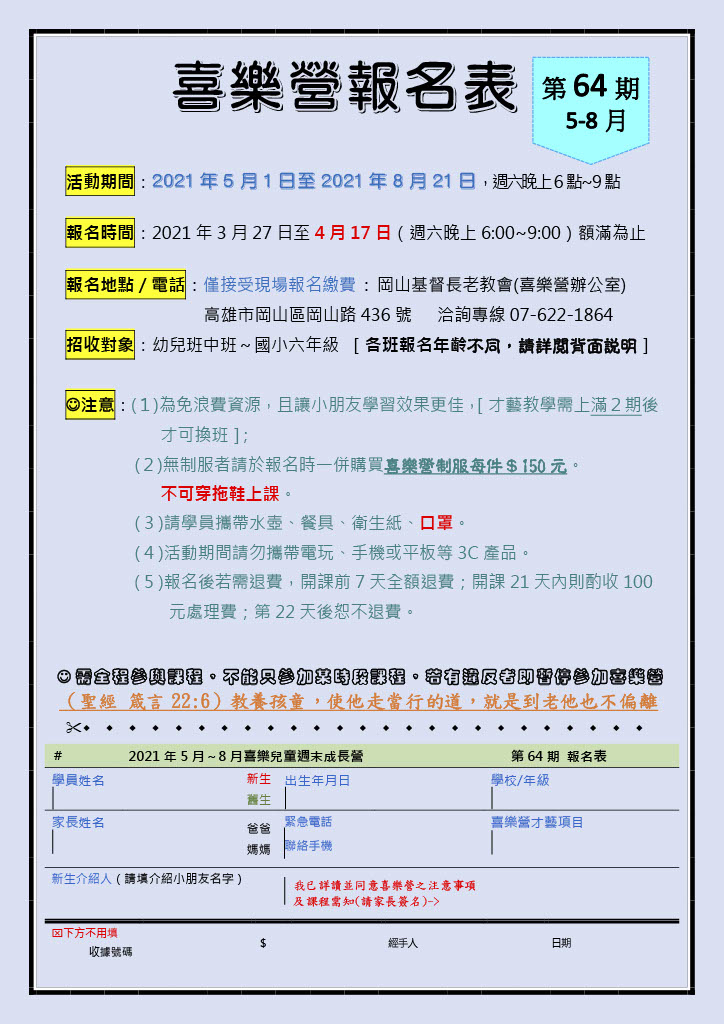 第64期 (2021/5/1~2021/8/21) 喜樂營開始報名囉~~