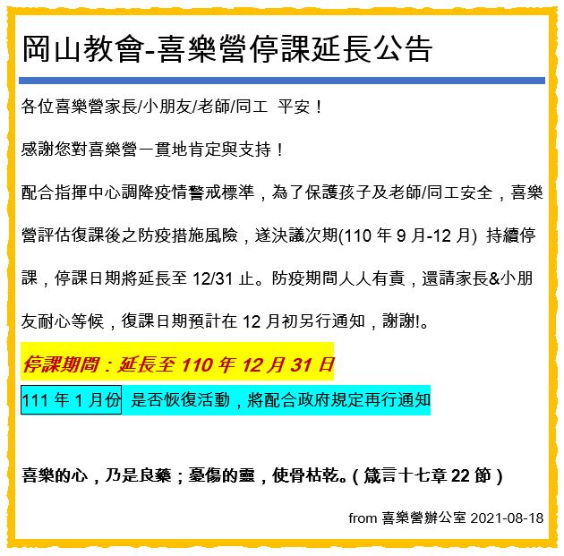 喜樂營停課延長公告